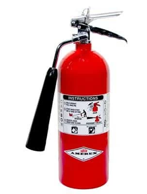 A Carbon Dioxide Fire Extinguisher is discharged as a white cloud of “snow” which smothers a fire by displacing oxygen. It is effective for Class B flammable liquids and is electrically non-conductive. Carbon Dioxide is a clean, non-contaminating, odorless gas.